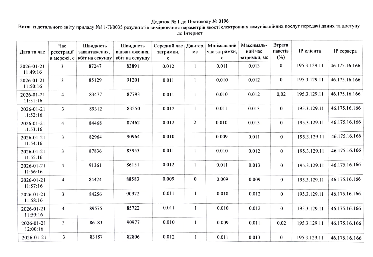 Додаток до протоколу вимірювання параметрів та розрахунку показників якості передачі даних та доступу до Інтернет ТОВ «Зв'язковий» 2025 р.